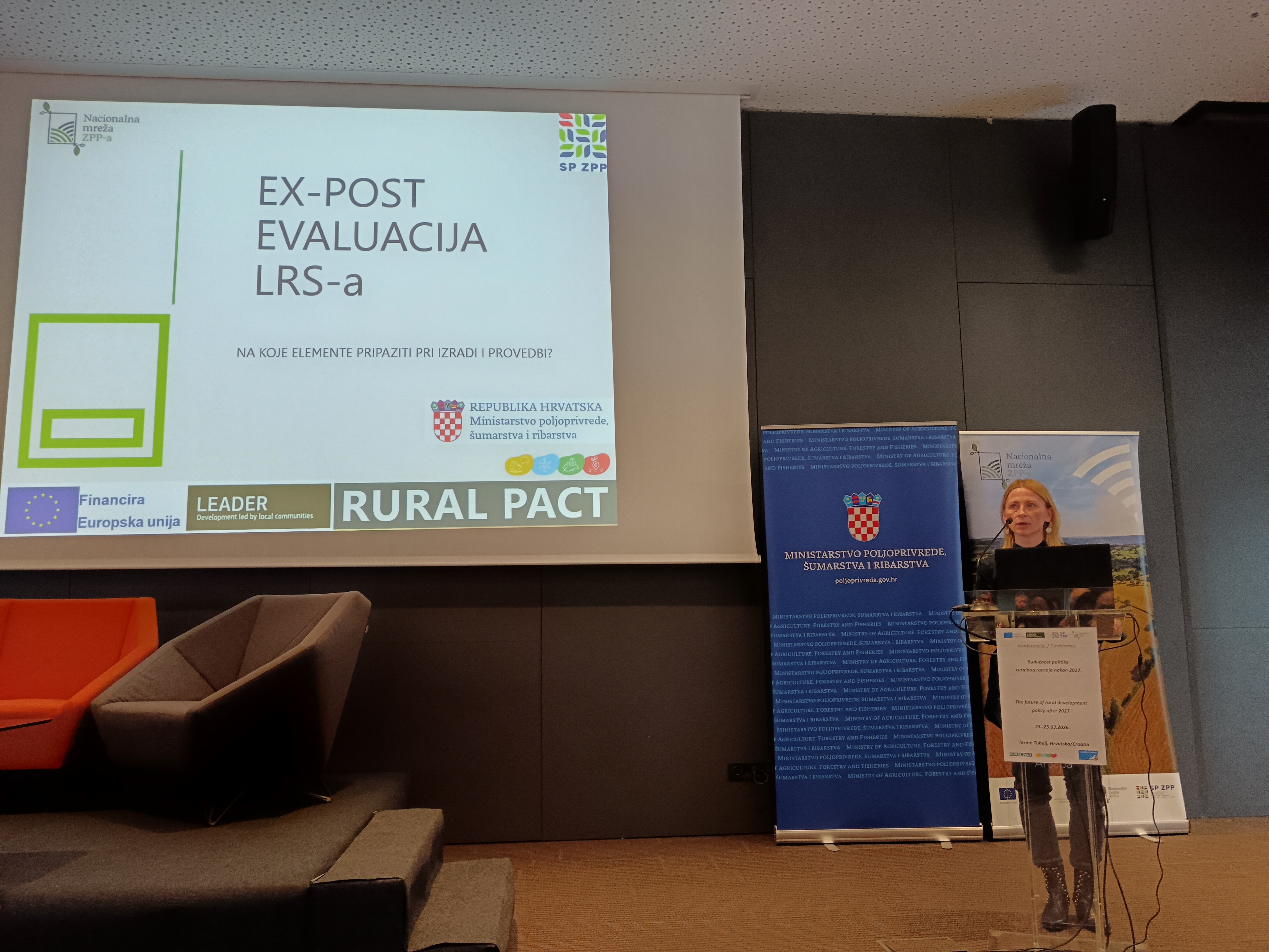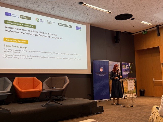 U okviru završnih institucionalnih napomena, gđa Željka Gudelj-Velaga, ravnateljica Uprave za potpore poljoprivredi i ruralnom razvoju Ministarstva poljoprivrede, šumarstva i ribarstva. Posebno je naglasila važnost transformacije ruralnih područja i osiguravanja uvjeta za ostanak mladih uz konkretnu podršku politika vezanih uz ruralni razvoj. Osvrnula se i na vrijednu ulogu LAG-ova koji najbolje prepoznaju lokalne potrebe i izazove i već dugi niz godina suradnjom s kreatorima politika čine svoje lokalne sredine vitalnijima, življima, povezanijima i poželjnijima za život. Naglasila je ovom prilikom kako novo vrijeme pred nama traži i nove modele suradnje te ovoga puta imamo jedan zajednički cilj – dokazati da je LEADER vrijedan alat ruralnog razvoja koji treba dalje razvijati. Zaključila je kako je ova konferencija utrla dobar put za daljnju suradnju te se nada budućim partnerstvima sa svim dionicima LEADER-a.