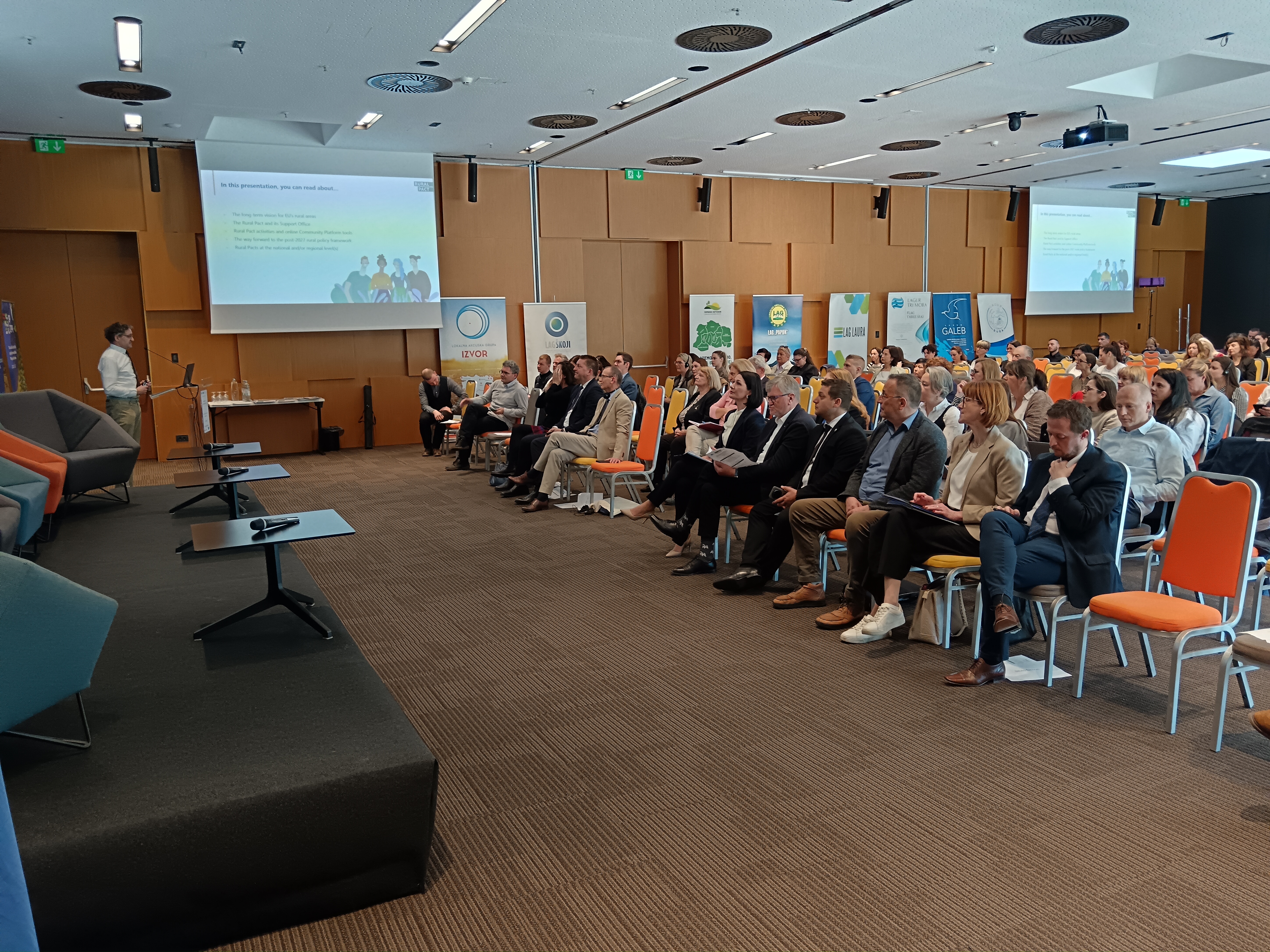 Prisutnima se obratio i g. Piotr Sadlocha, predsjednik ELARD-a i poljske mreže LAG-ova, a čije je izlaganje bilo posvećeno jačanju LEADER-a i CLLD-a unutar NRPP-a u novom programskom razdoblju, uz obvezu namjenskog izdvajanja sredstava te pregledu modela provedbe LEADER/CLLD-a u Poljskoj u prošlom i za novo programsko razdoblje 2028.-34. U nastavku je Edina Ocsko, članica EU Mreže Pametnih sela i potpredsjednica Koordinacijske skupine Ruralnog pakta iznijela njegove ključne preporuke za politike razvoja ruralnih područja nakon 2027. Ovaj skup izlaganja završio je prezentacijom gđe Betty-Ann Bryce iz organizacije za ekonomsku suradnju i razvoj (OECD) koja je ovom prilikom naglasila važnost stvaranja politika temeljenih na dokazima i Rural proofing. Prvi dio dana završio je panel raspravom prethodno spomenutih izlagača.