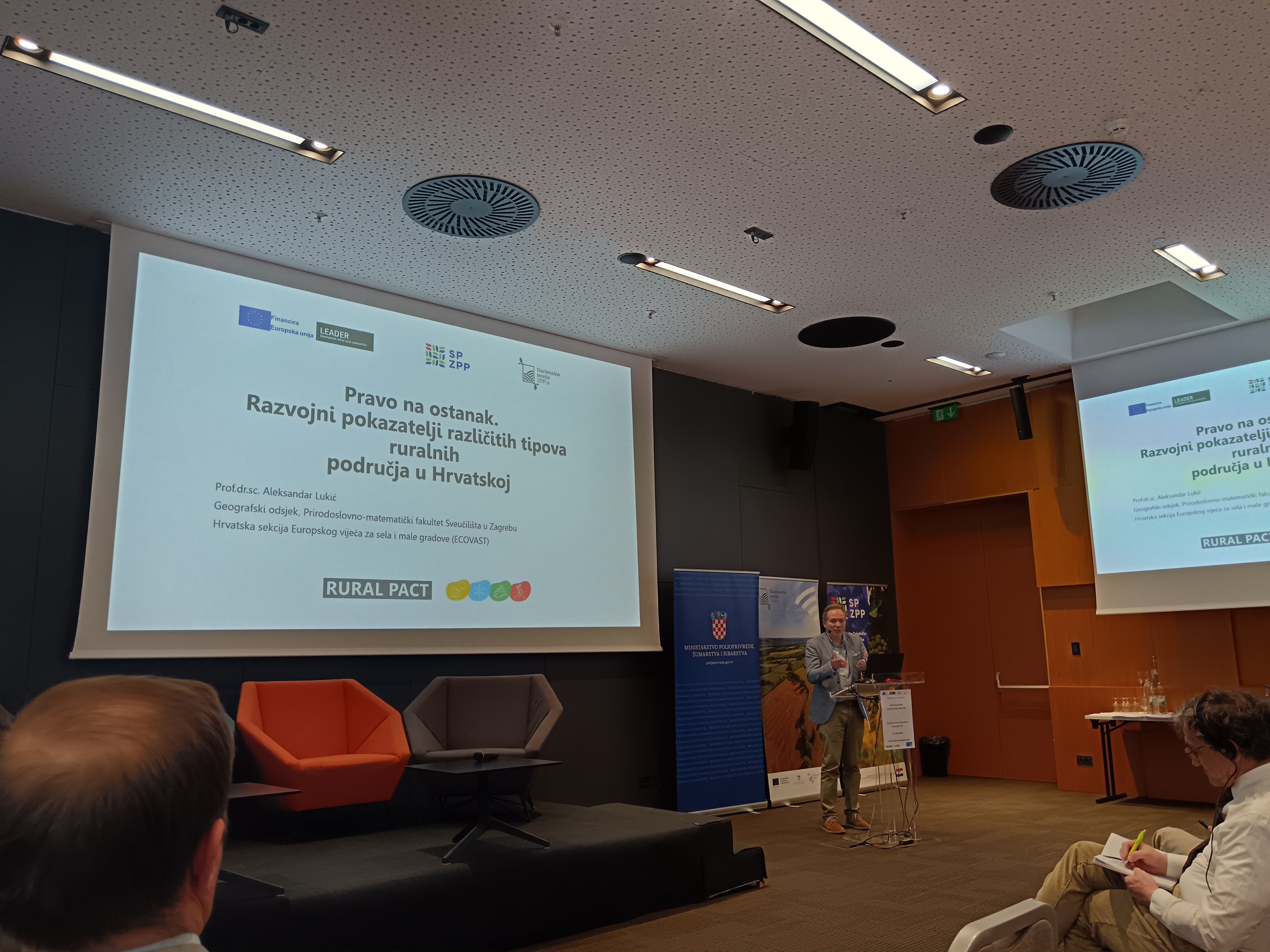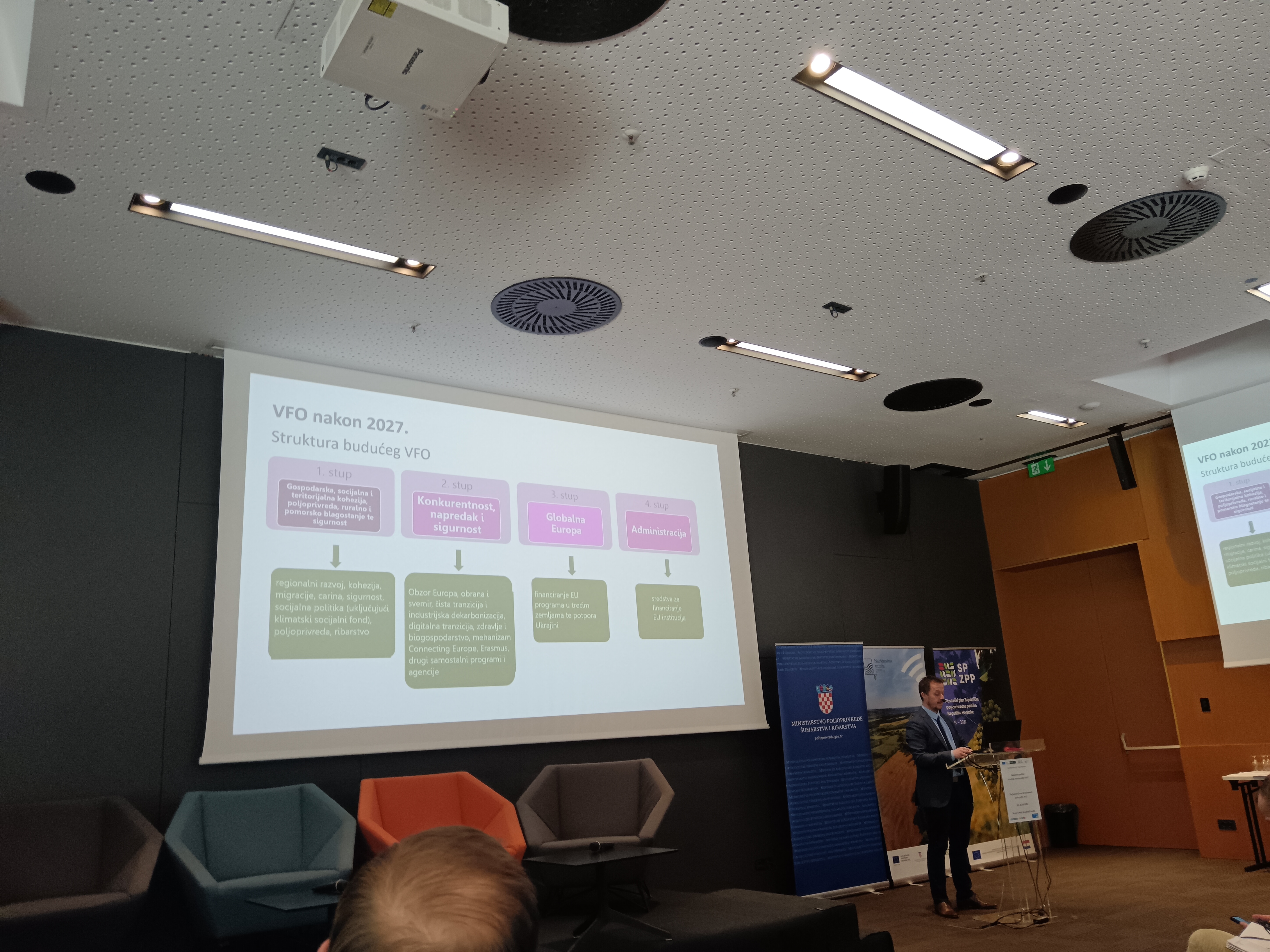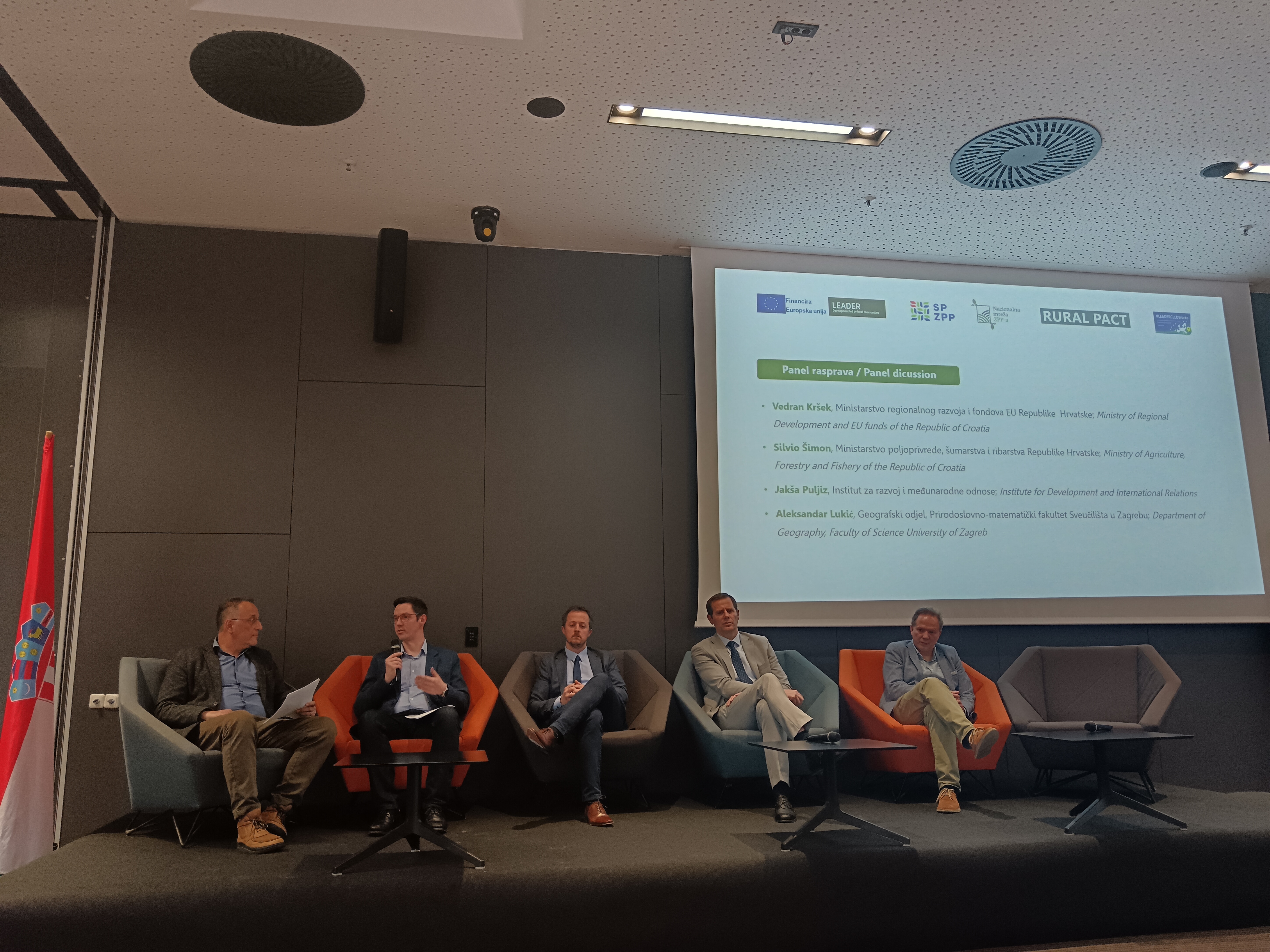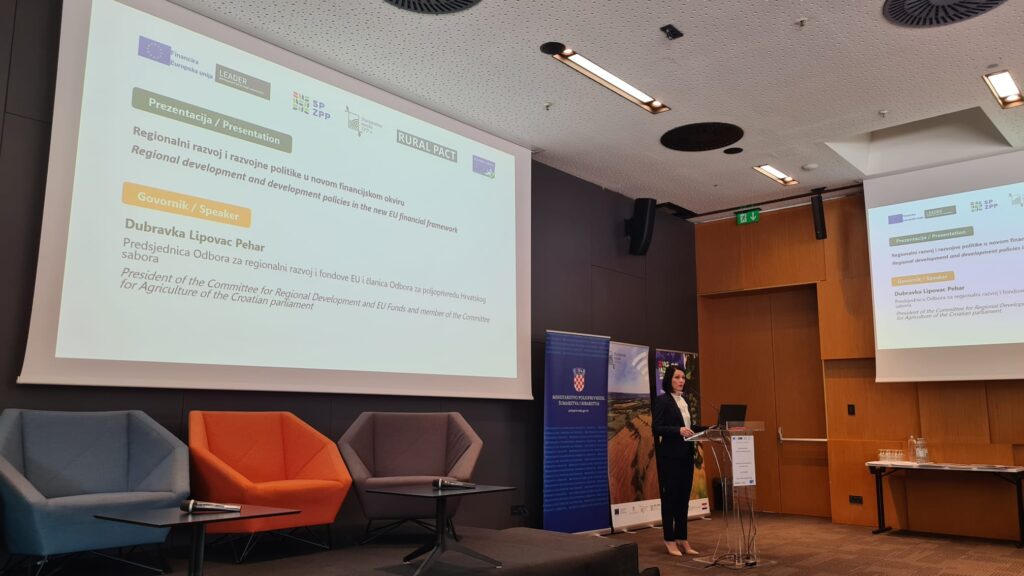 Drugi dio dana sudionicima je donio prikaz novog VFO-a i Zajedničke poljoprivredne politike s posebnim osvrtom na generacijsku obnovu putem izlaganja dr.sc. Silvia Šimona, predstavnika Ministarstva poljoprivrede, šumarstva i ribarstva. Dr.sc. Jakša Puljiz, ravnatelj Instituta za razvoj i međunarodne odnose (IRMO) podijelio je sa sudionicima hrvatska iskustva s teritorijalnim alatima EU te iznio pouke za budućnost. Uslijedilo je izlaganje prof.dr.sc. Aleksandra Lukića s Prirodoslovno-matematičkog fakulteta Sveučilišta u Zagrebu, u čijem je fokusu bilo pravo na ostanak i razvojni pokazatelji pojedinih tipova ruralnih područja u Hrvatskoj. Predstavnik Nacionalne zaklade za razvoj civilnog društva, g. Branko Logarić, , prisutnima je predstavio doprinos Nacionalne zaklade ruralnom razvoju kroz programe podrške društvenim inovacijama. Dio posvećen politici ruralnog razvoja u Hrvatskoj danas i nakon 2027. završio je panel raspravom izlagača kojima se pridružio i g. Vedran Kršek, predstavnik Ministarstva regionalnog razvoja i fondova EU.