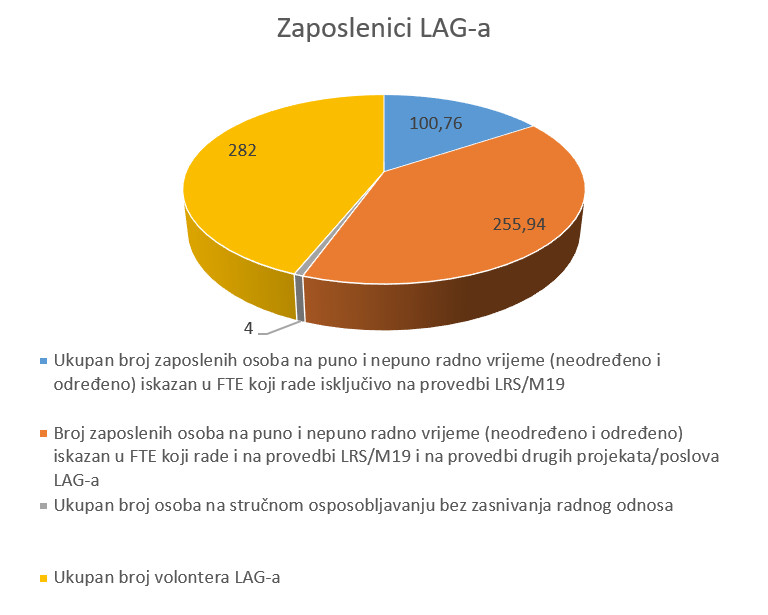 Tijekom 2020. godine isključivo na provedbi lokalnih razvojnih strategija (Mjera 19) je bilo zaposleno ukupno 100,76 osoba na puno i nepuno radno vrijeme iskazano u FTE (Full-time equivalent), što iznosi 1,90 osoba prosječno po LAG-u. Broj osoba koje su pored provedbe lokalnih razvojnih strategija bile zaposlene i na drugim projektima/poslovima iznosi ukupno 255,94 na puno i nepuno radno vrijeme iskazano u FTE (Full-time equivalent), što iznosi 4,74 osobe prosječno po LAG-u. Ukupan broj svih zaposlenika u 2020. godini je iznosio 356,7 na puno i nepuno radno vrijeme iskazano u FTE (Full-time equivalent), što prosječno po LAG-u iznosilo 6,64 po LAG-u. Ukupno je u radu LAG-ova sudjelovalo 282 volontera i 4 osobe na stručnom osposobljavanju bez zasnivanja radnog odnosa.