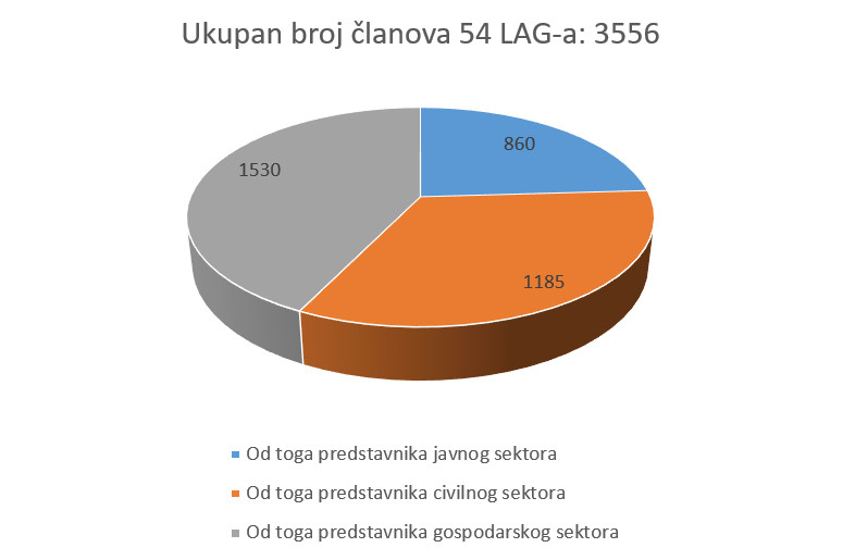 LAG-ovi su ukupno imali 3556 članova, što je prosječno po LAG-u iznosilo oko 66 članova. Upravni odbor LAG-a je prosječno imao 13 članova.
