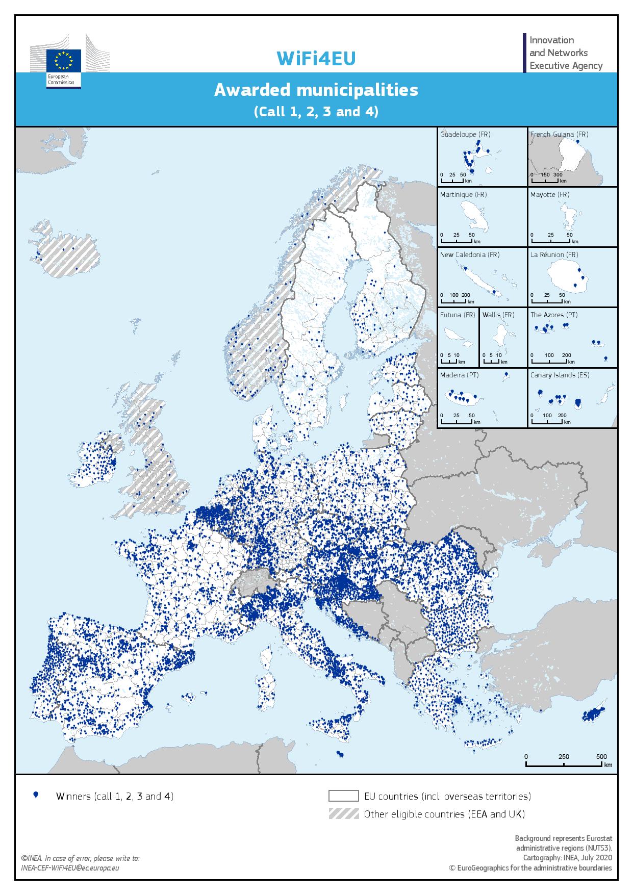 Nakon četiri uspješna poziva za prijavu, vrlo je uzbudljivo vidjeti kartu općina koje će imati koristi od financiranja u okviru sheme WiFi4EU. Plave točkice, koje predstavljaju pobjedničke općine sa svih poziva, ravnomjerno su raspoređene po cijelom kontinentu, pružajući građanima šireg područja Europe priliku da uživaju u besplatnoj Wi-Fi povezanosti gdje god živjeli.